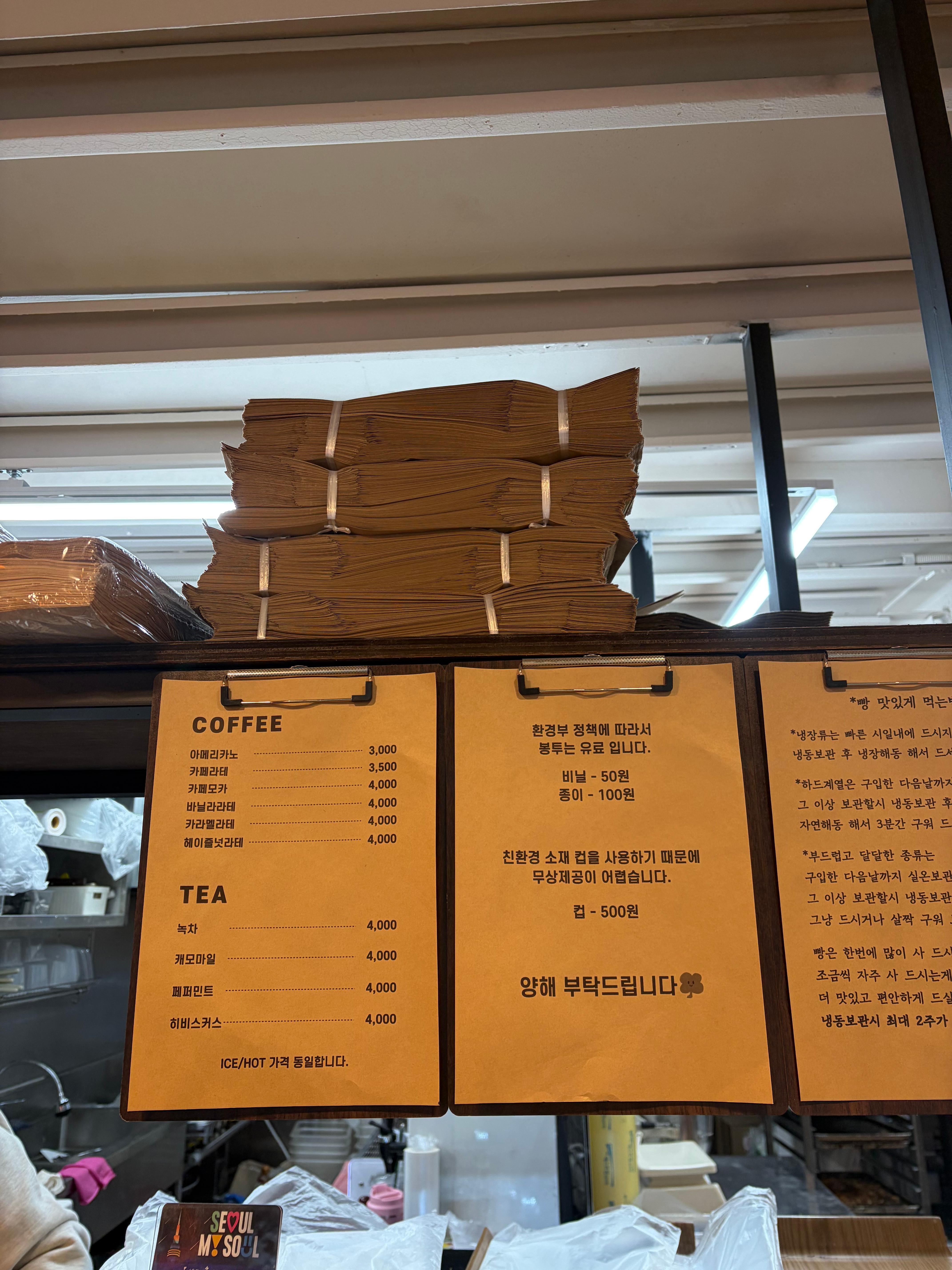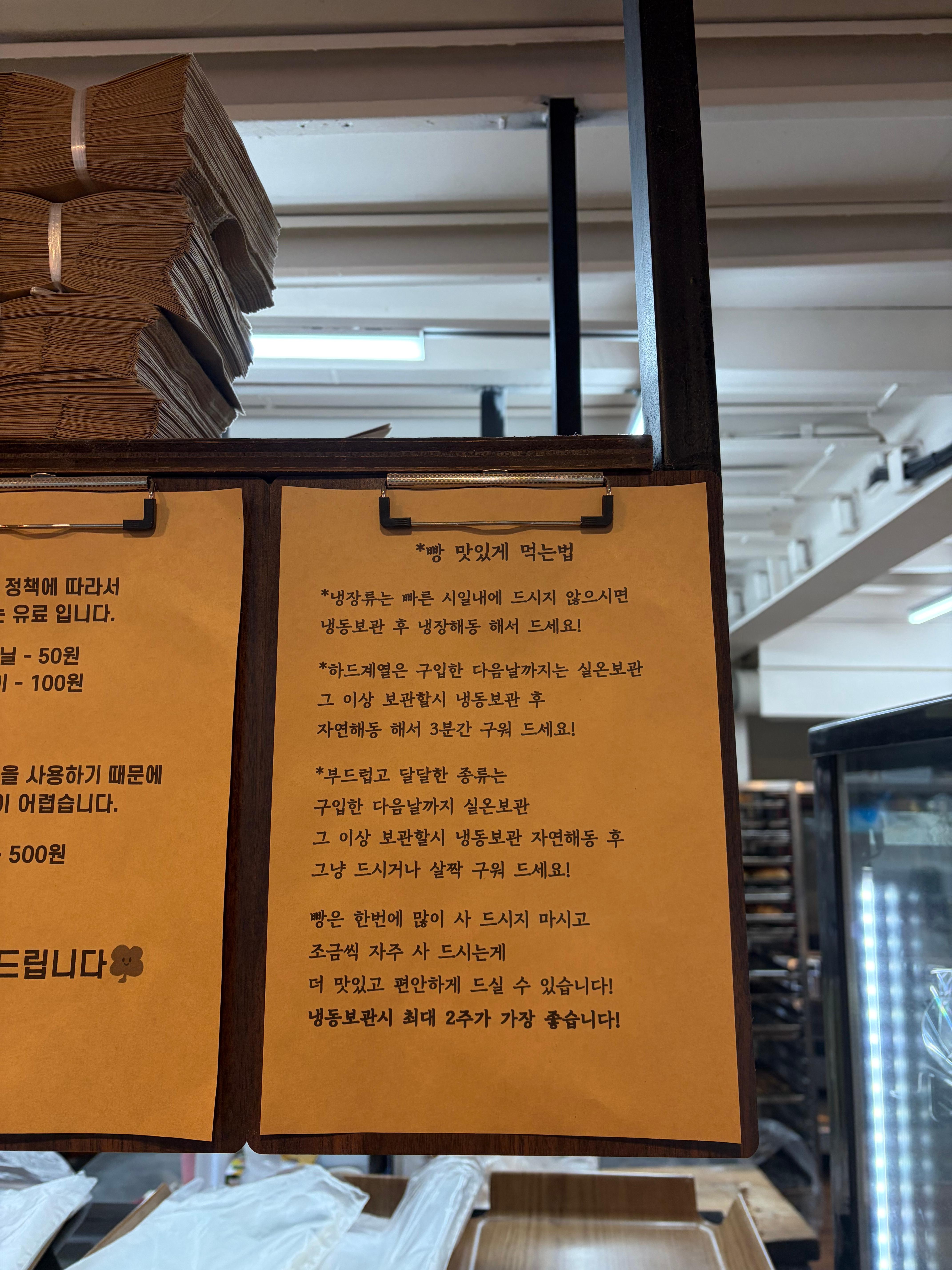 카운터 옆에는 커피메뉴와 "빵 맛있게 먹는 법" 까지....!