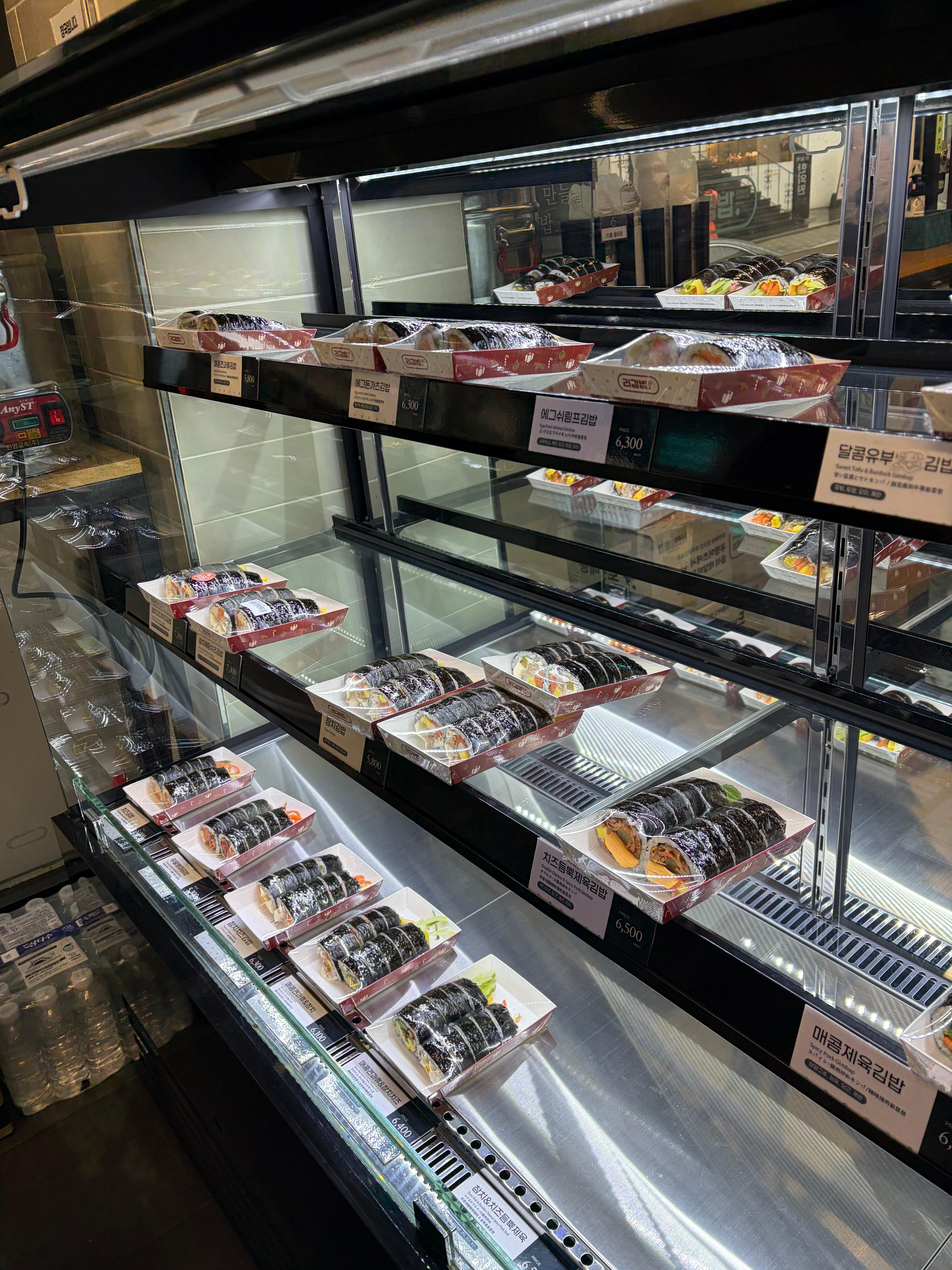 냉장고에 이렇게 종류별로 김밥들이 진열되어 있어요 ~