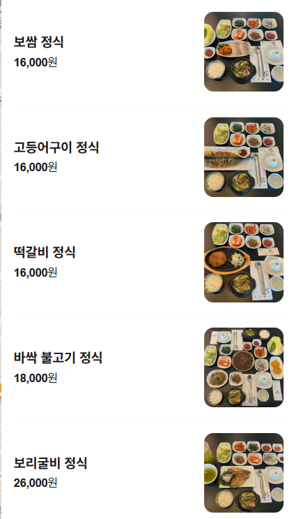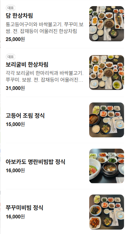 네이버 지도에서 가져온 ㅎ 담 대표 메뉴들이에요 ㅎㅎ